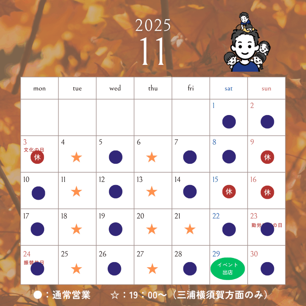 11月の営業日です。 2025年10月28日 最終更新日時 : 2025年10月28日 takashitsutsui 11/29はマゼラン佐島にてイベント出店いたします。 急な寒さで体調を崩す方が多いので、温めてお過ごしください😊