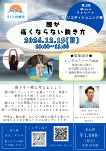 2024年12月15日 第2回Miuraリトリート「膝が痛くならない動き方」を開催致しました。 当日、9名が参加されて1時間という短い時間でしたがお話と実技をさせていただきました。 まだまだ改善点の多いイベントですが、少 […]