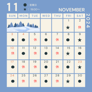11月、12月の営業日となります。 年内は今のところ、30日午前中までとしています。 よろしくお願いいたします。